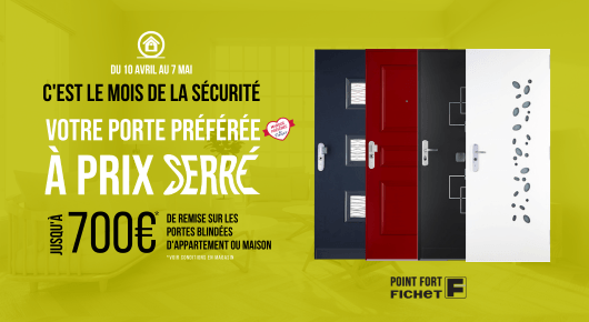 A cette occasion profitez de remise jusqu'à 700€ sur les portes blindées Fichet d'appartement et de maison. Rendez-vous vite dans l'un de nos concessionnaires Point Fort Fichet participants.